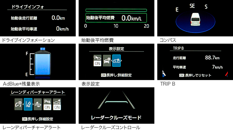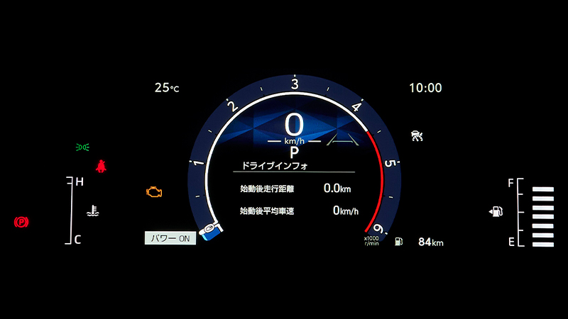 また、メーター中央部には平均燃費や瞬間燃費、後続距離やコンパス等、様々な情報を選択して表示可能となっている。