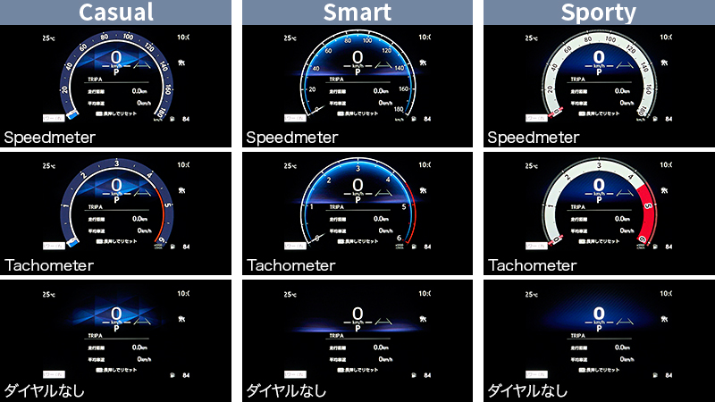 物理的な文字盤や針のない液晶表示メーターなので、色々な情報を選択して表示できるし、好みで見た目のカスタマイズも可能だ。