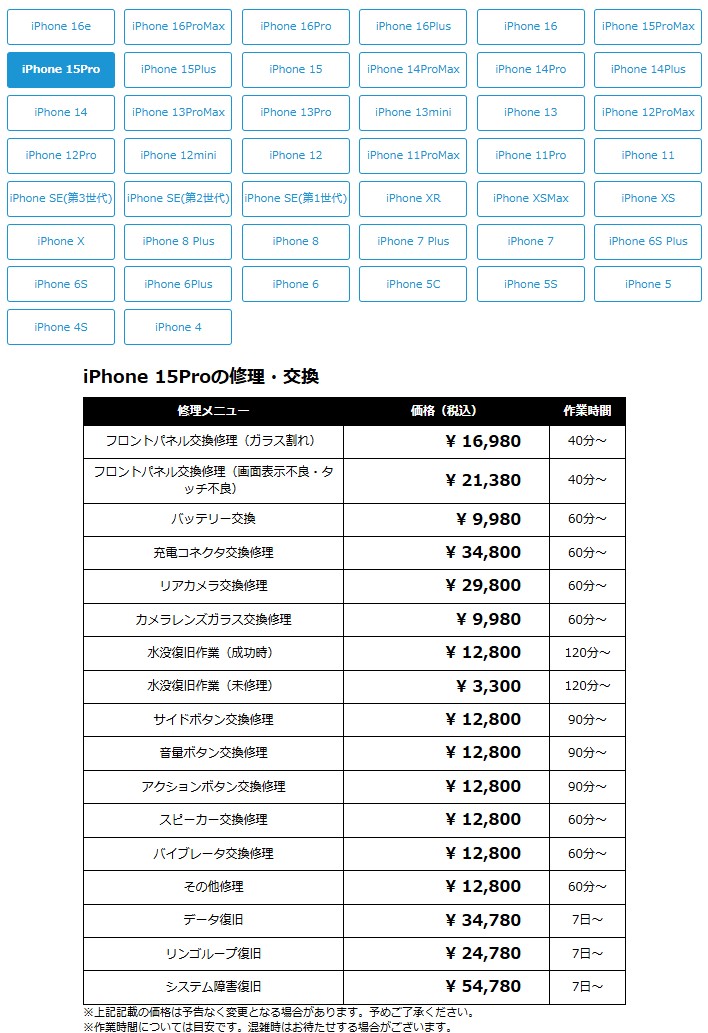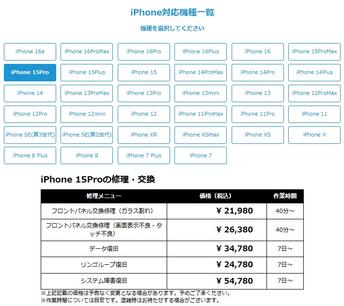 ちなみに、修理代金はWEBページに記載されている。