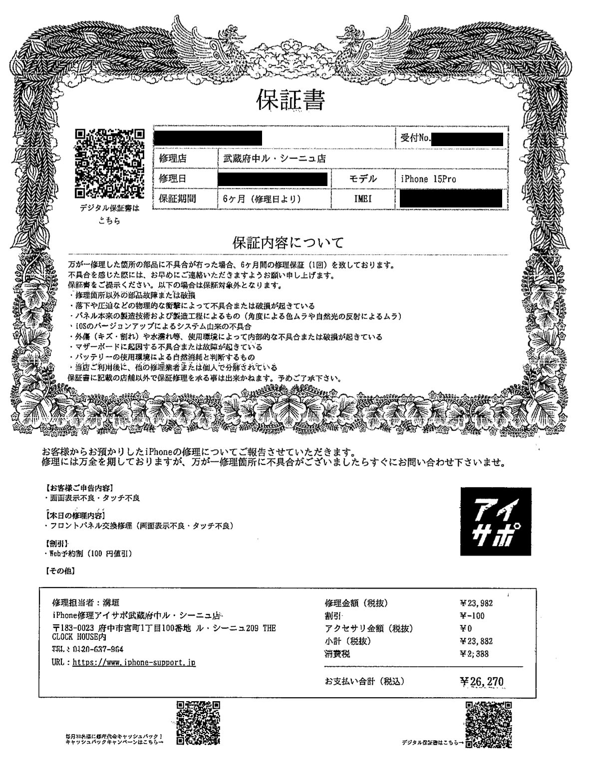 修理したiPhoneに不具合が生じても無料で修理対応してくれる保証書もついてきた。