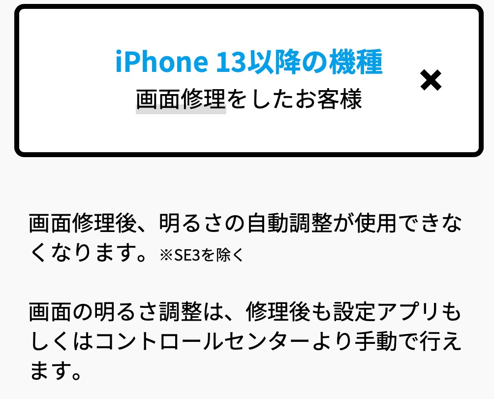 今回は液晶の交換修理ということで、WEBページ記載通りの26,800円の見積額だった。また、このときアップル純正液晶ではなく互換品による修理ということと、互換品による機能の違いとして、以下の説明を受けた。