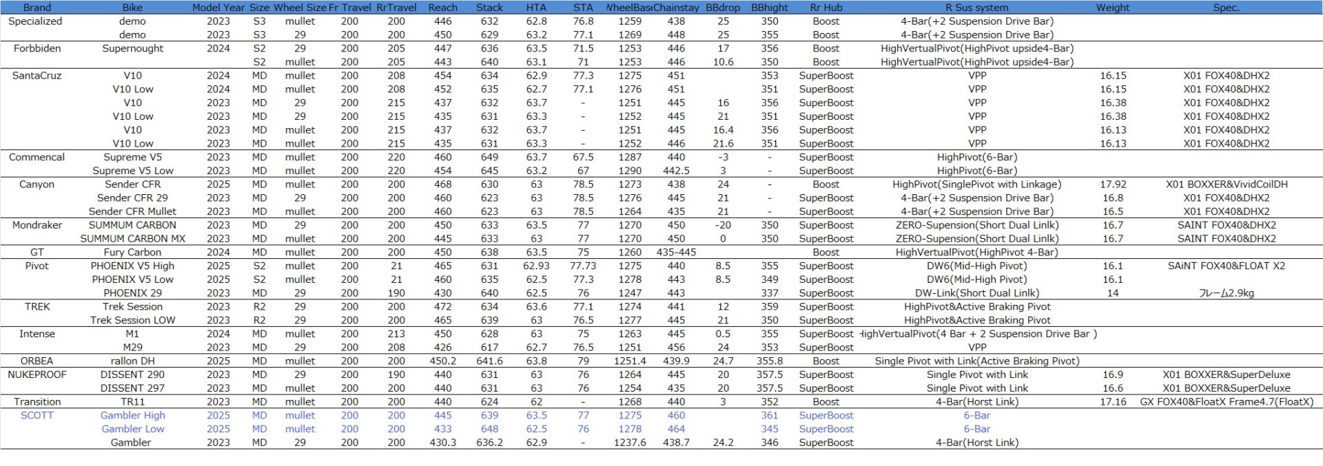 48Rがスペシャライズド エンデューロを購入するときに作ったジオメトリー 一覧表だが、ダウンヒルバイクバージョンも作ってたので、そちらも共有します。