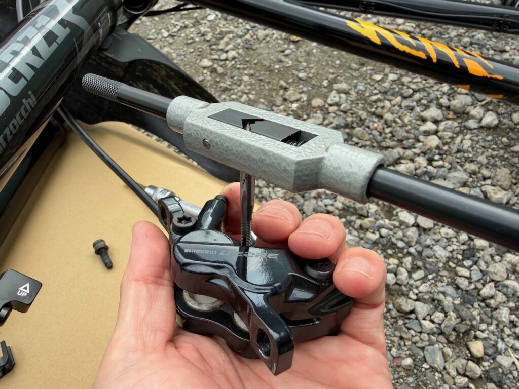 キャリパー側が柔らかいアルミなので、軽い力でタップが入っていく。