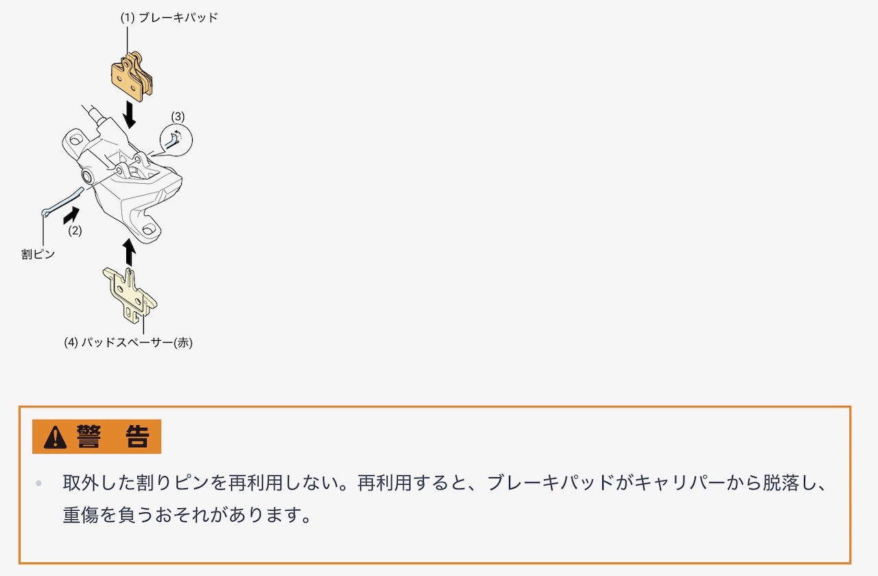 割りピンが金属疲労で折れてパッドが抜け落ちるリスクがあるので再利用厳禁なのだ(実際には2,3回くらいは再使用したことあるが、自己責任である)。