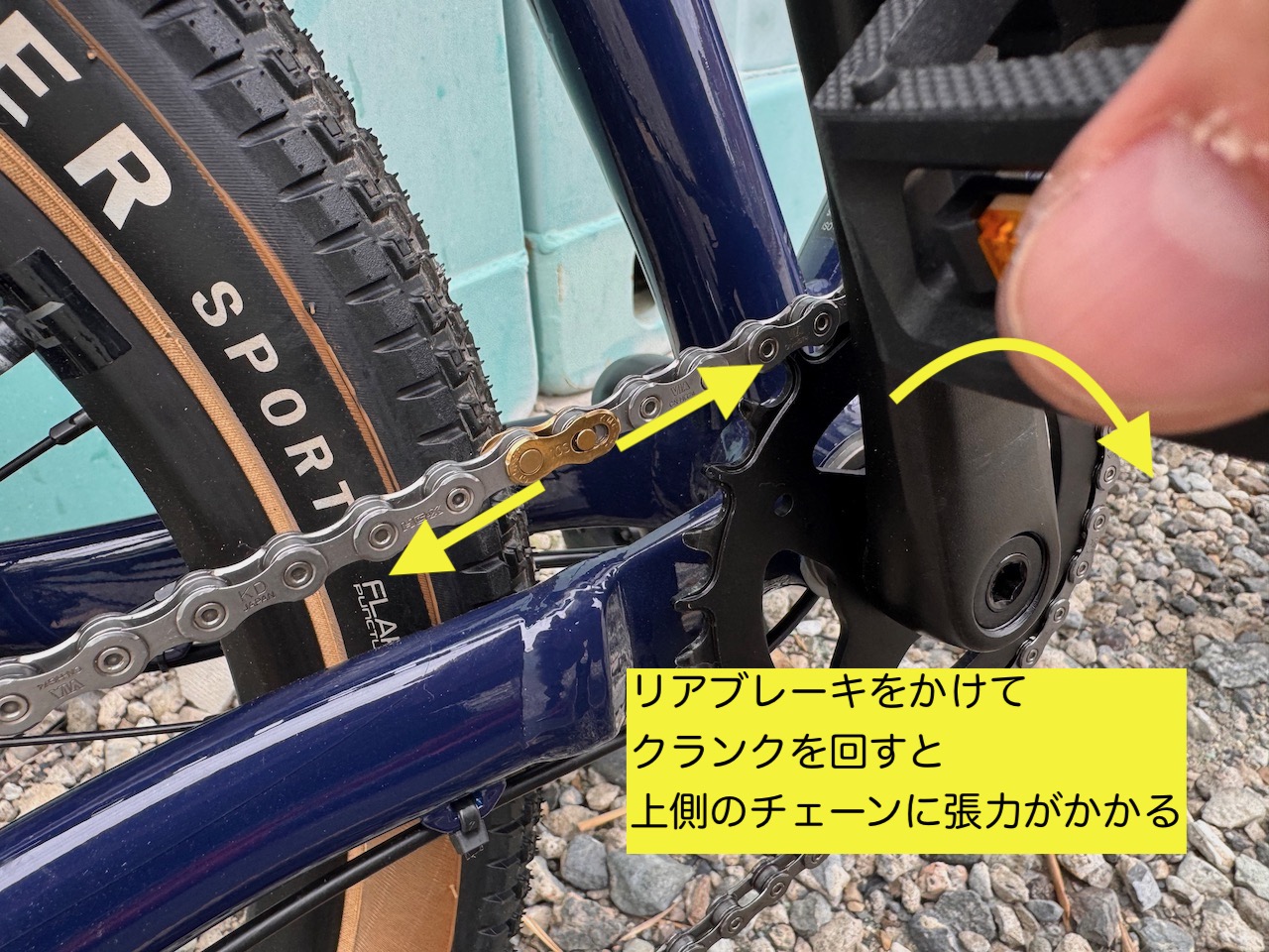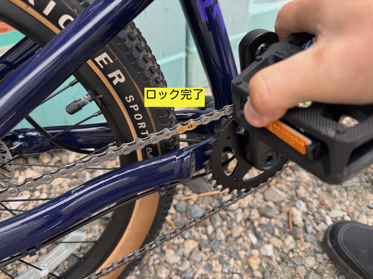 ロックするときは、ミッシングリンクが上側のチェーンラインにくるようにして、リアブレーキを握り込んだままクランクを回す。