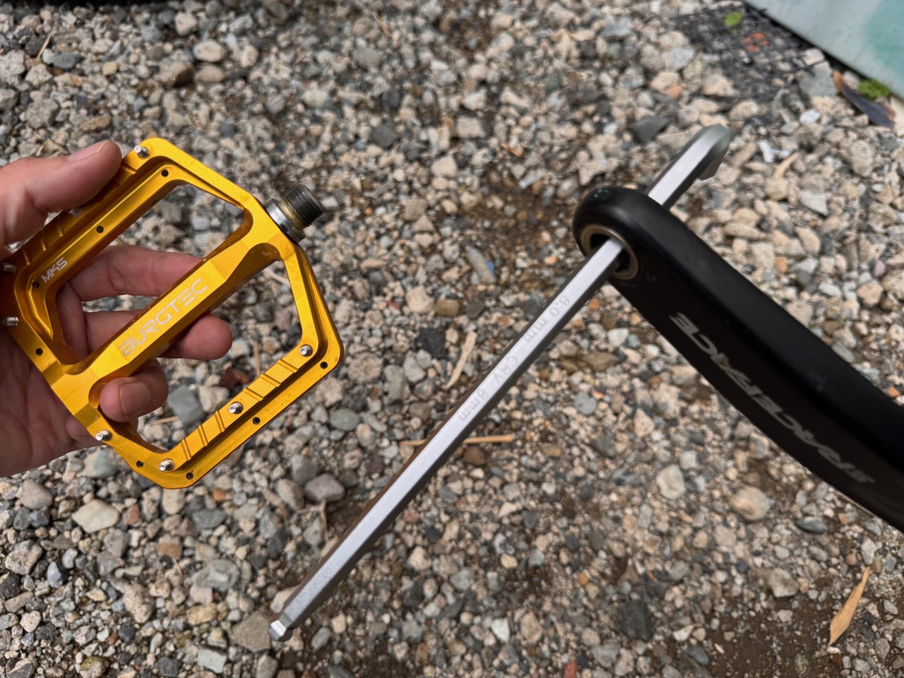 ペダルネジは固着して硬いことも多いので、8mmの六角レンチは携帯工具レベルのものではなく、ロングタイプがあると外しやすい(固着ペダルと対戦するには、スピンナーハンドルに8mm六角ソケットでも良いくらいだ)。