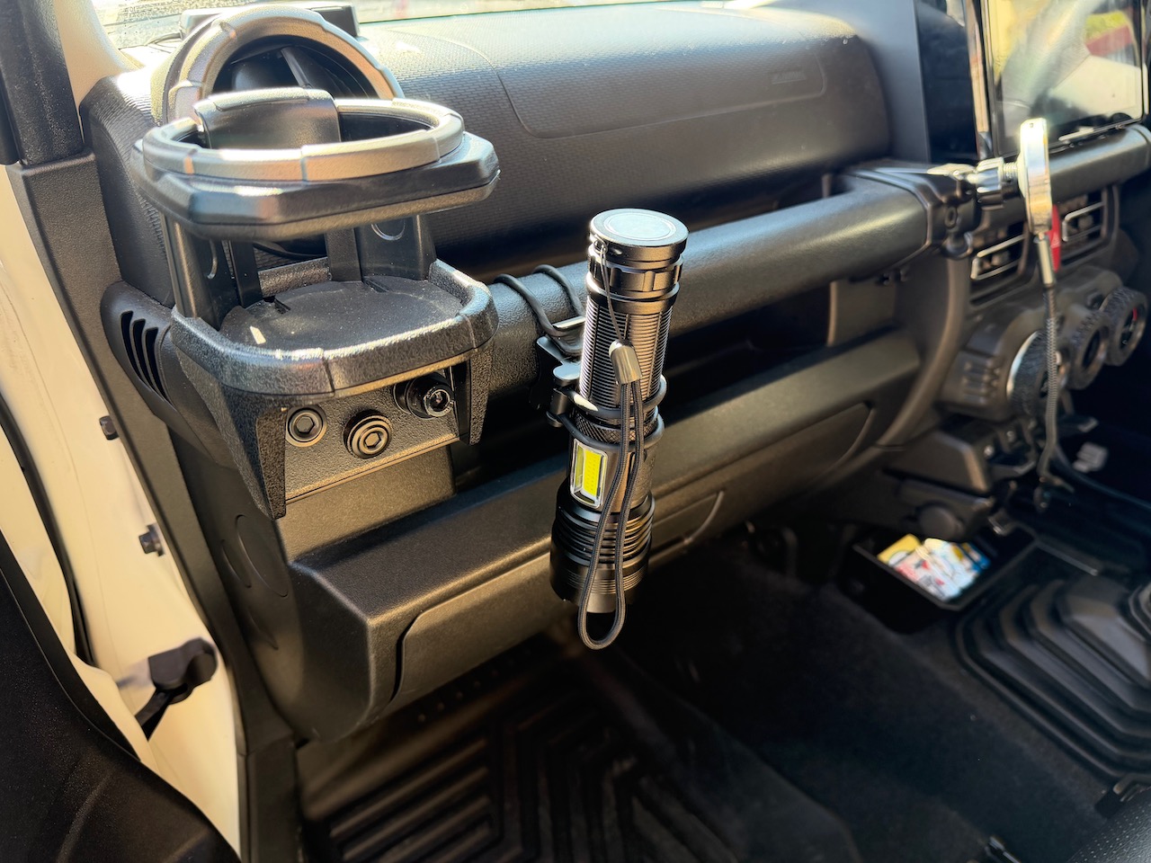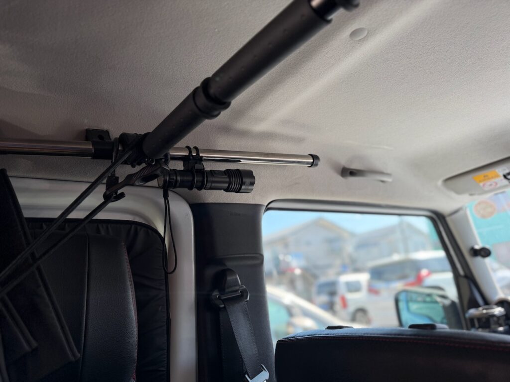 ハンドルにライトを取り付けられるということは、ジムニーのアシストグリップやパイプラックにライトを収納するのにええやん!ということで購入。