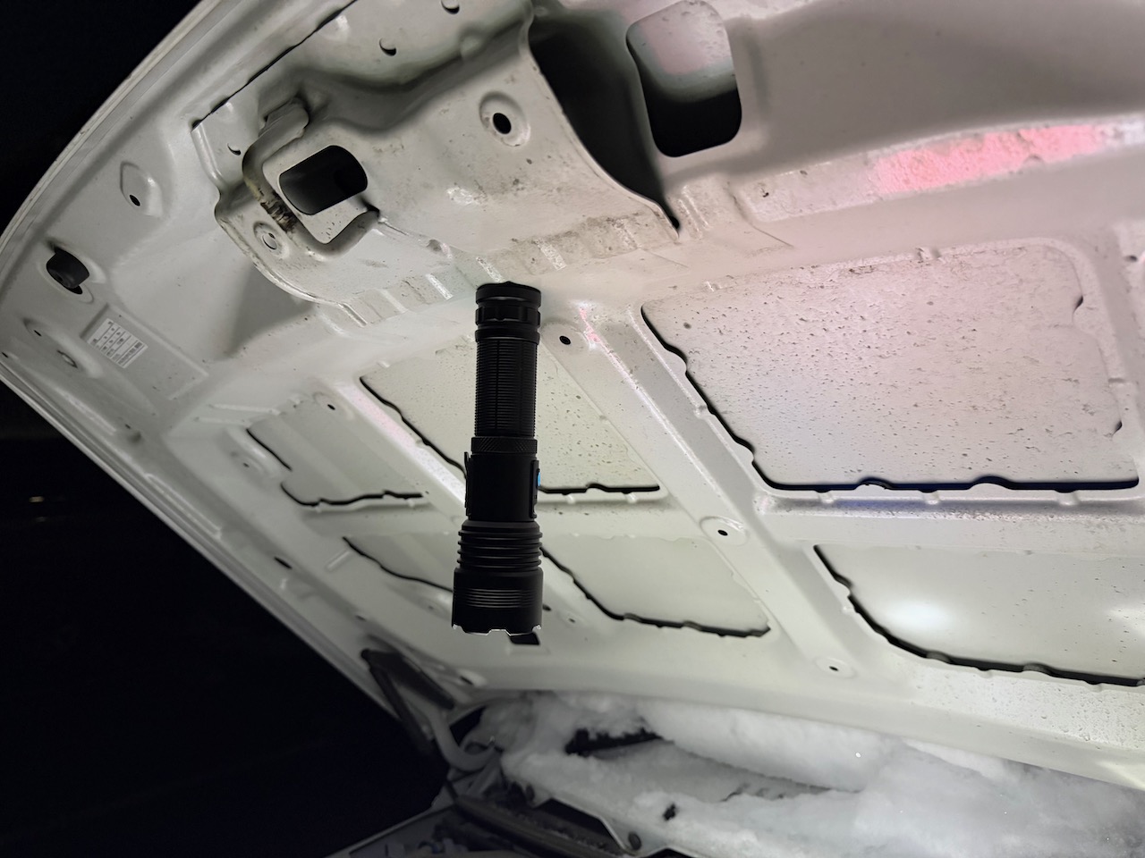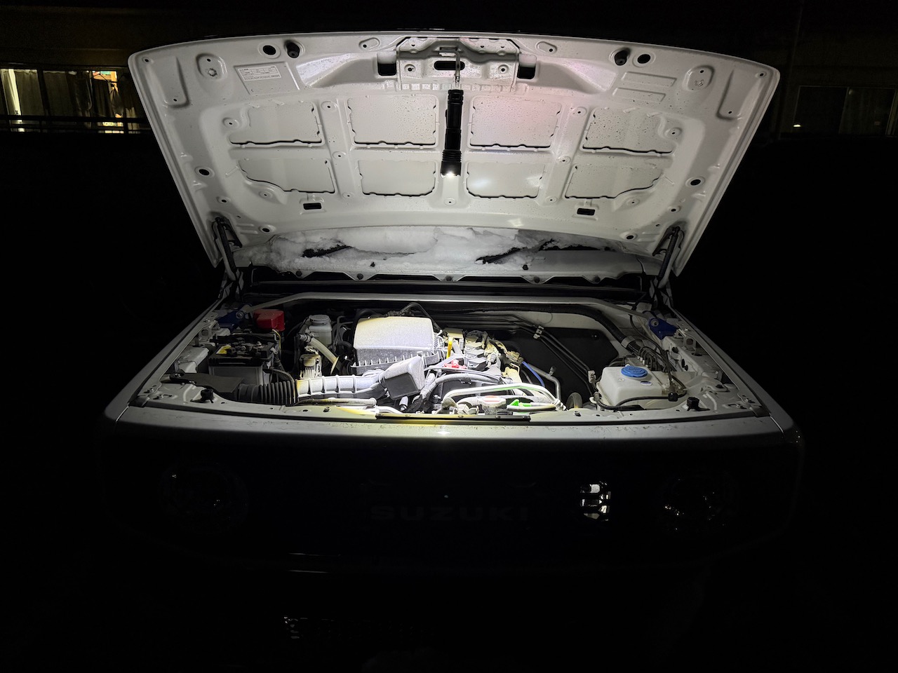ボンネット裏にマグネットで固定なので、万が一の夜間のトラブル対応(バッテリー上がりとかヒューズ交換とか)にもハンドライトがあると心強い。