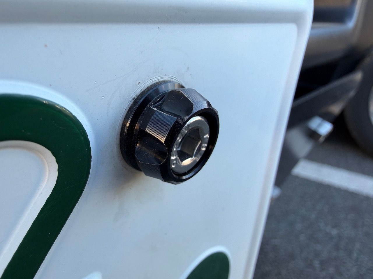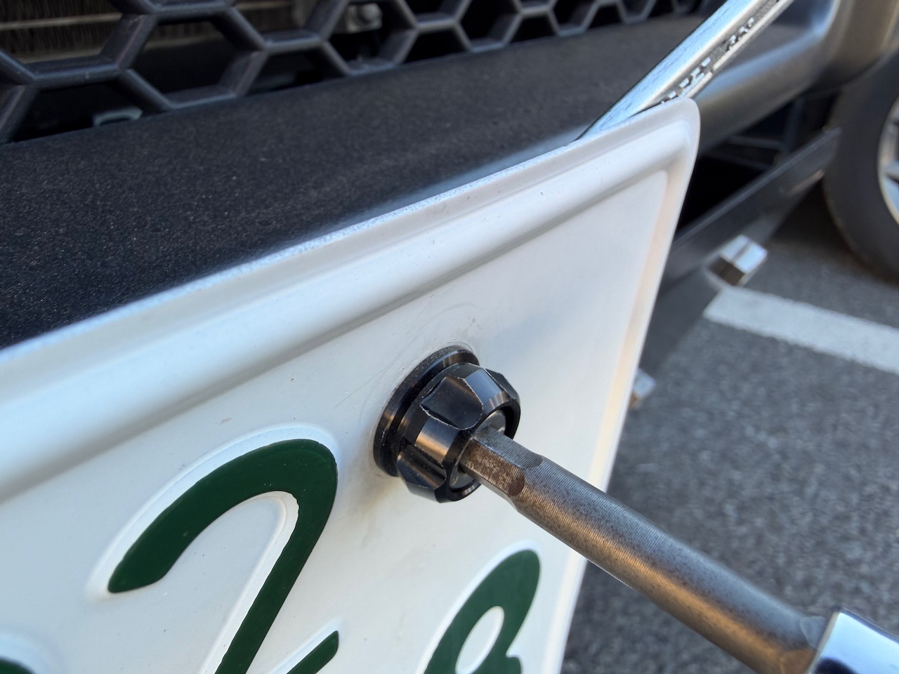 ちなみに、リアのナンバープレートボルトも同様に交換できるが、普通車のジムニーシエラの場合はボルトの封印があるので1本しか交換できない(軽のジムニーなら、リアのナンバープレートボルト2本とも交換できる)。