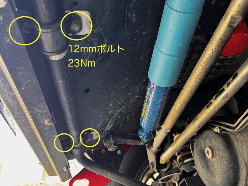 スタビライザーマウントの12mmボルトを取り外す。48R号のハイブリッジファーストのショートバンパー&スキッドプレート装着の場合、後ろ側のボルトはそのまま取り外し可能。前側のボルトはわずかにスキッドプレートに干渉するので、首振りエクステンションで対応した。