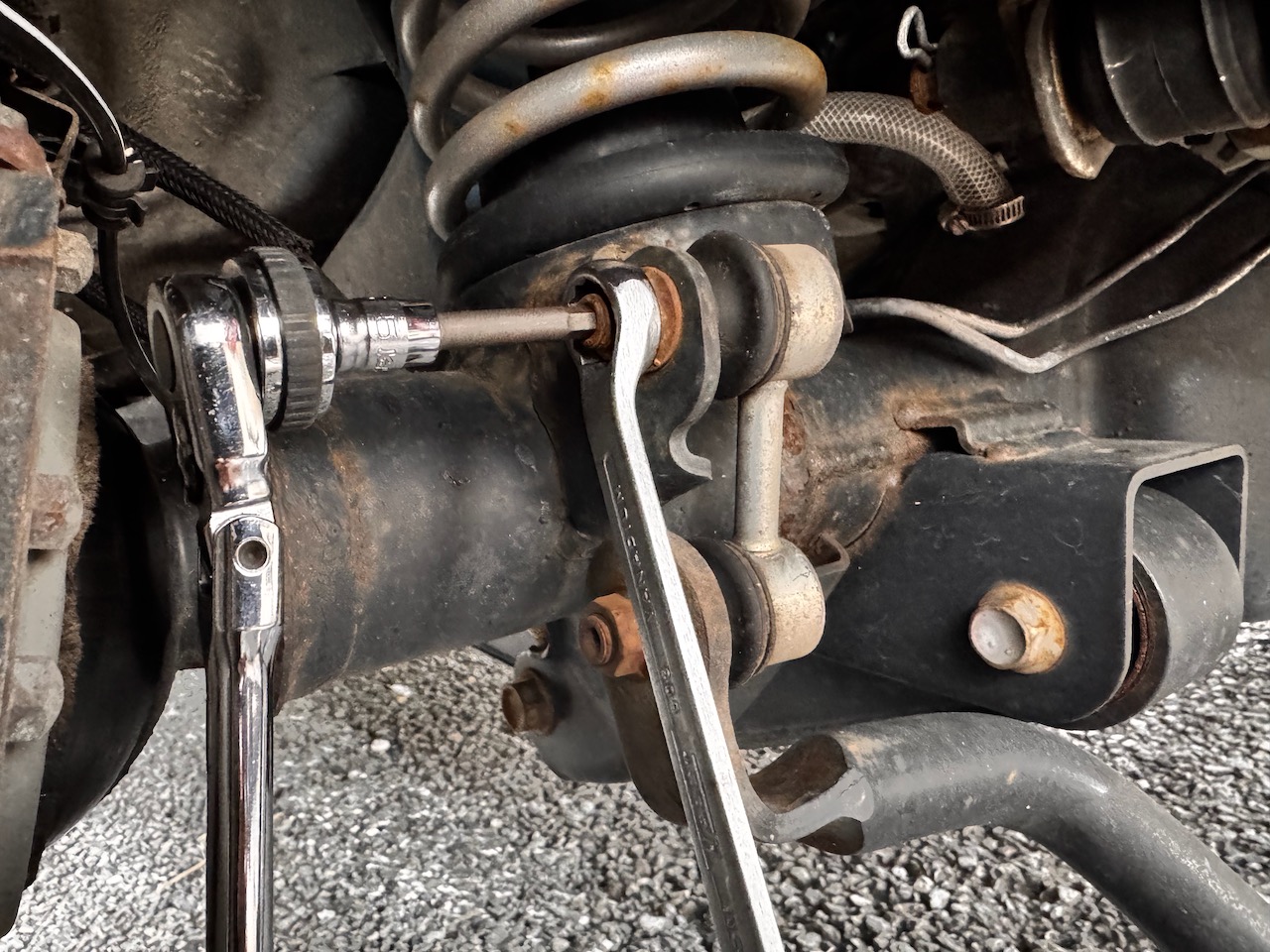 そのままナットを緩めてもボルトが共周りしてしまうので、下のようにスタビリンクのボルト根本の二面幅14mmを薄口スパナで固定してやると良い。