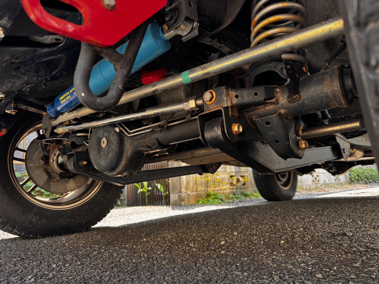 (キャスター角寝かせての直進安定性向上狙いで1インチアップに対し2インチアップの補正をしている) - ボディ補強(ストラットタワーバー、強化ボディマウント、ドアスタビライザー、ピラーバー)