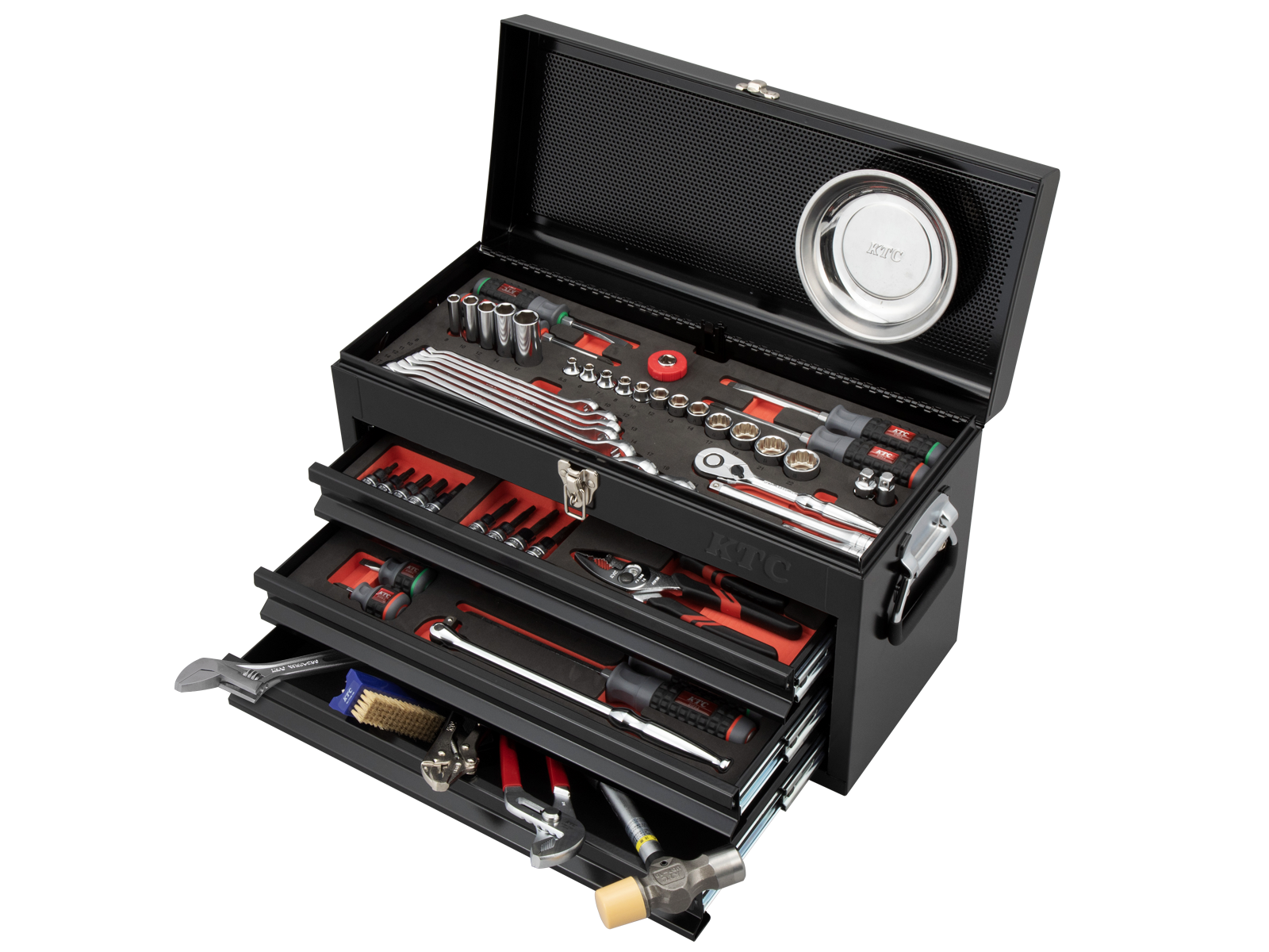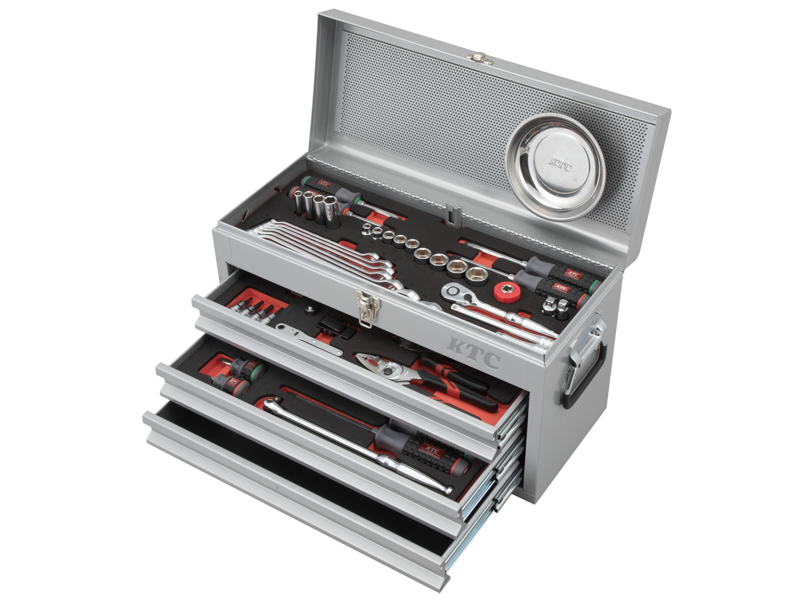 さらにKTCの三段チェスト(工具箱)は高品質で引き出しの開閉はスムーズだし、基本工具は上段と3段の引き出しのうち上2段に収まっており、3段目の引き出しは追加工具の収納としての拡張性もある。
