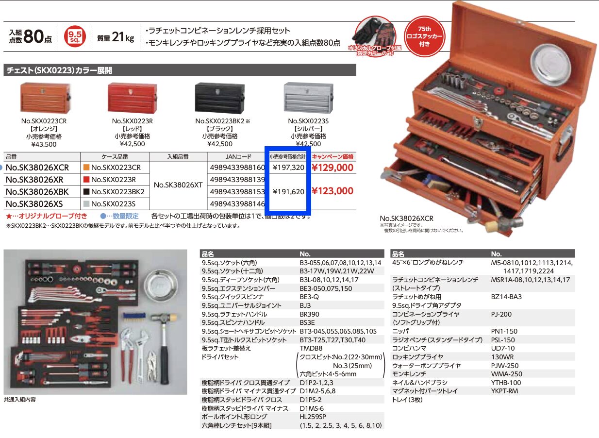 例えば、SKセールのチラシをみると、「小売参考合計価格」というバラ売りで揃えた場合の合計価格が記載されているのだが、下記の工具セットの場合、定価ベースで約36%もの割引率になっている。